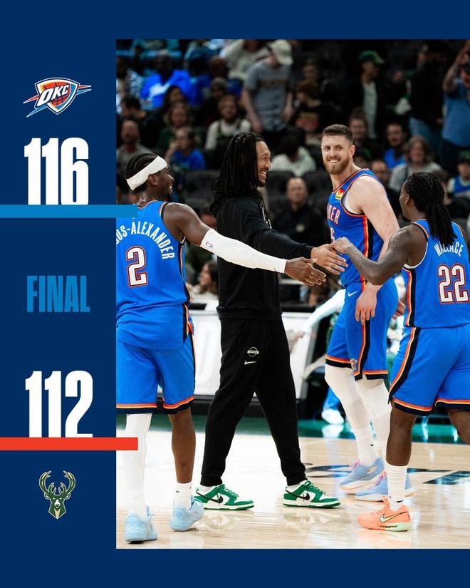 萊昂斯連中2記三分球,雷霆穩(wěn)住局面。薩納西斯完成強勢上籃,OKC請求暫停??柹?罰全中,薩納西斯再次沖擊內(nèi)線得分。吉昂命中遠投,距離終場僅剩100秒,雷霆領先5分占據(jù)場上主動權。薩納西斯失誤,南斯轟進遠投,勝負懸念再起。揚布拉德2罰全中,南斯遠投不進,時間走完。最終,雷霆以116比112險勝雄鹿。
